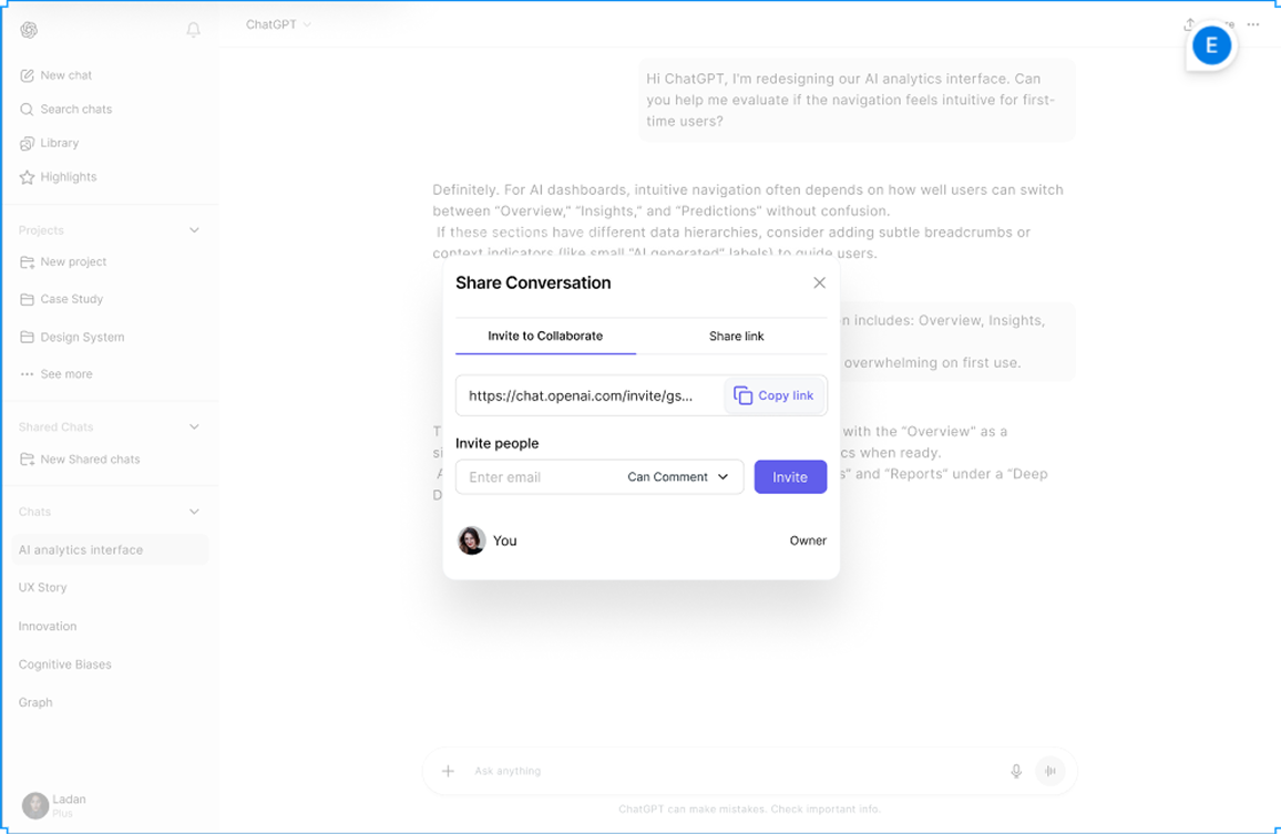 The Collaborative Chat feature bridges the gap between individual and team use without trying to replace existing tools. By enabling lightweight co-review and discussion within shared chats, it reduces repetitive content generation and keeps collaboration contextually connected. This approach turns ChatGPT into a more efficient, shared thinking space; helping teams stay aligned while maintaining focus within the product.