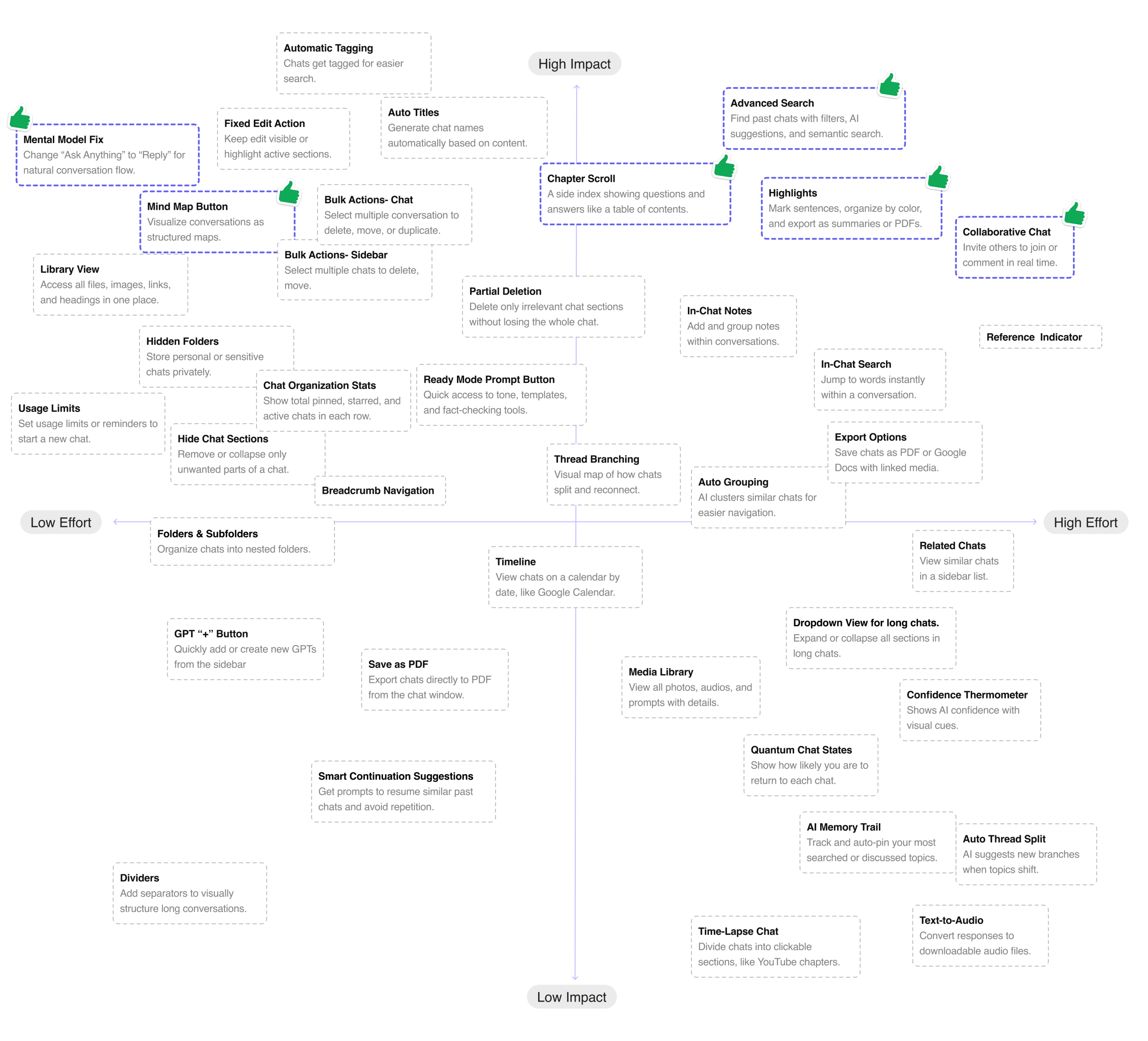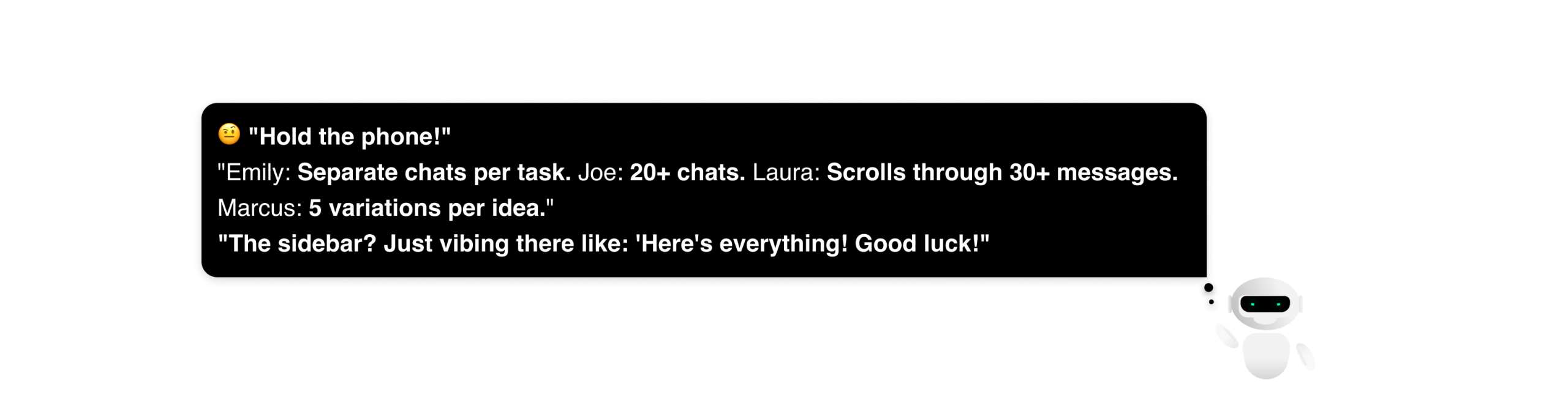 We combined insights from Reddit, ChatGPT forums, app reviews, and our own network. The feedback revealed recurring struggles with chat organization, history navigation, and workflow support.