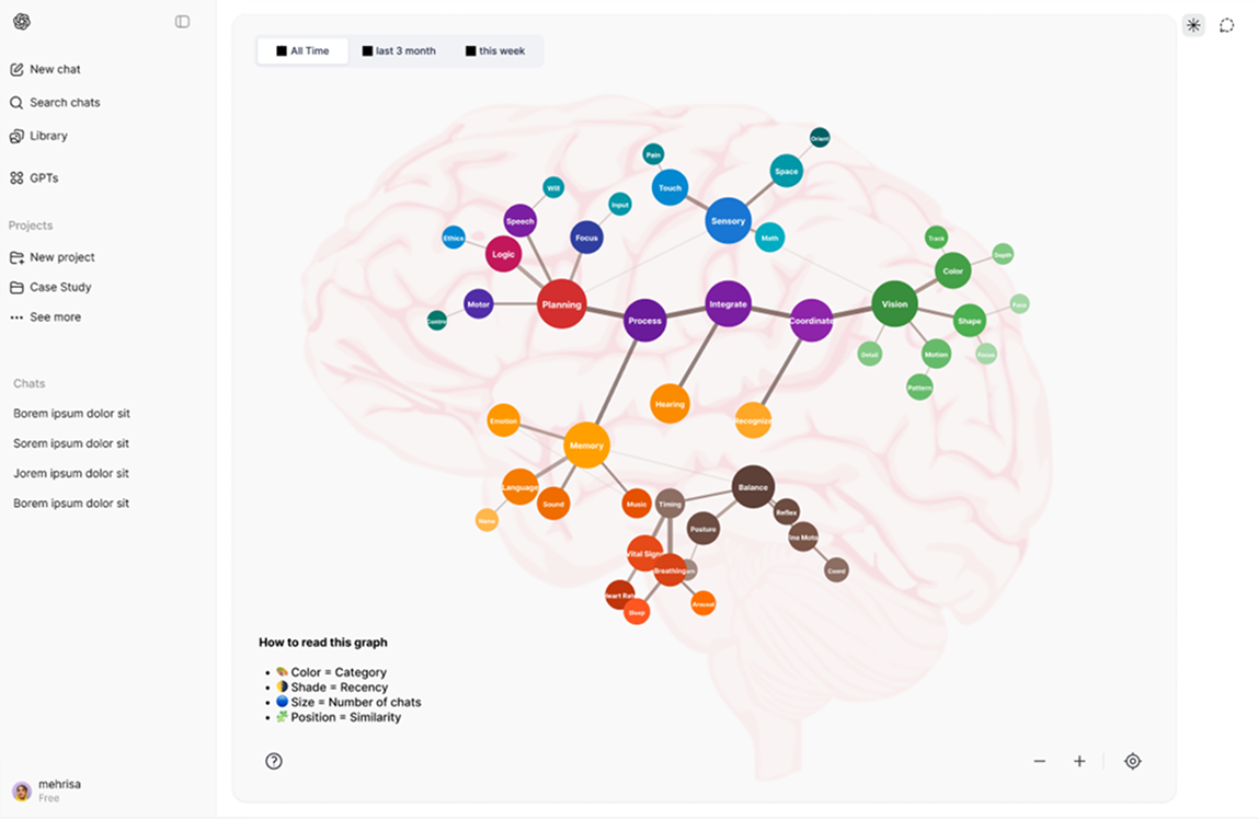 The Visual Mind-Map feature reimagines how users organize and reflect on their chat history. By turning conversations into structured, visual overviews, it helps users recognize patterns, revisit ideas, and maintain long-term context without scrolling through endless threads. While not designed to replace search tools, it adds emotional engagement and cognitive clarity, transforming history management from a task into an intuitive, meaningful part of the ChatGPT experience.