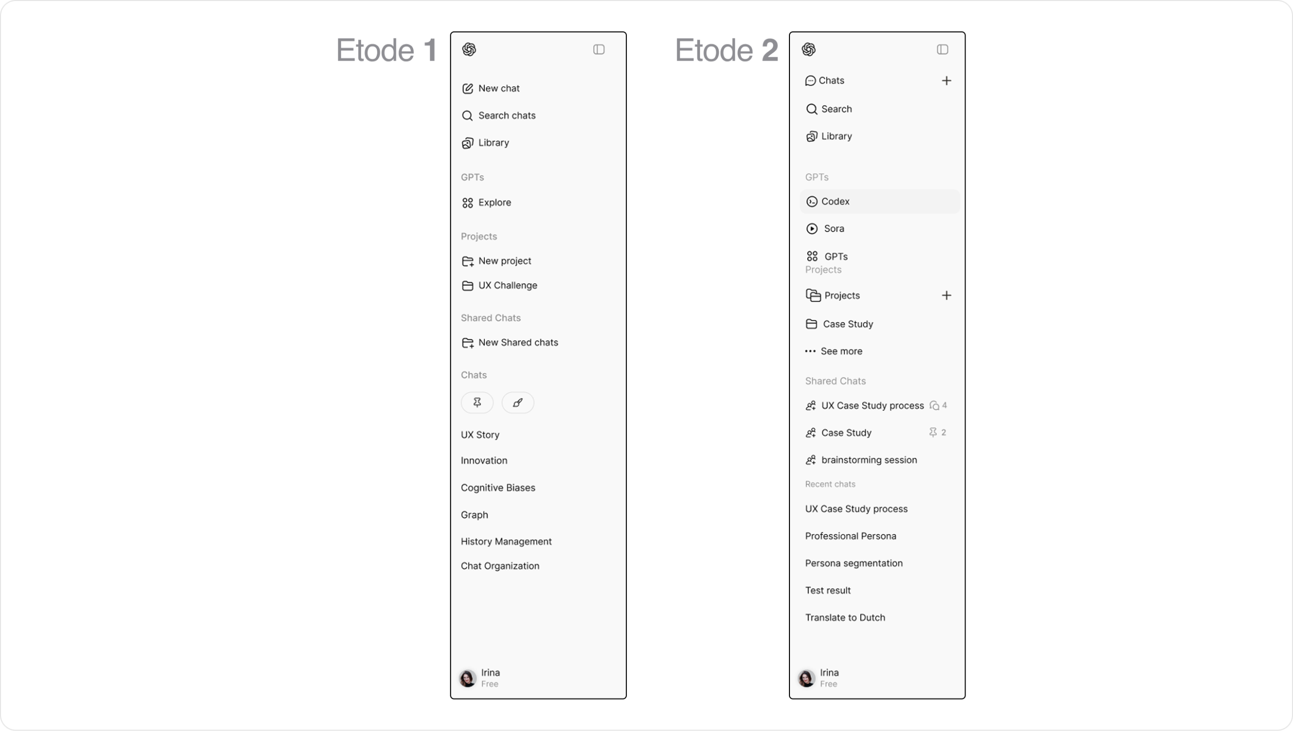 - Cleaner information hierarchy: sections with clear groupings (recent chats, projects, shared chats) vs. exposed chat list in UI 1